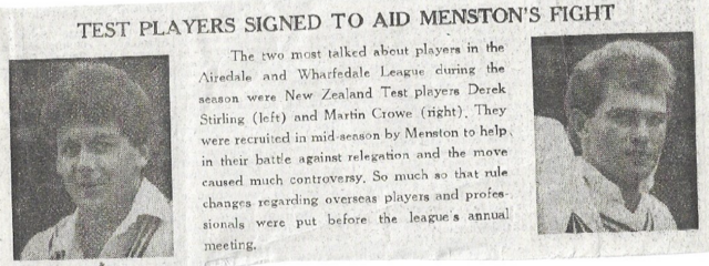 In Jack Kell’s book “Menston Remembered”, he records that ‘something of a stir’ was created and that dual signing of Crowe and Stirling ‘sent shock waves round the local leagues’. Inevitably, having players with Test experience playing for a village cricket club was a major talking point and caused much consternation within the Airedale & Wharfedale Senior Cricket League at the time.
